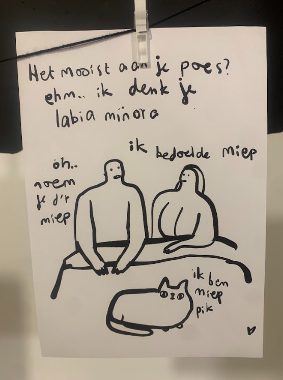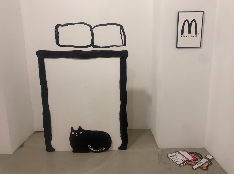 Hoe anders was en is dat bij Melroy Bisel. Onder de noemer @Lekkermenselijk, zegt hij werken te maken die van het scherm ontsnappen en met beide benen op de Almeerse grond staan. Dat leek in zijn serie over de kabouters wel degelijk te kloppen. Zijn protest ging, anders dan die van andere makers, over het lokale. Het hyperlokale zelfs. En bij die hyperlokale sfeer, lijken ook katten te horen. Het lijkt net alsof Minoes gereanimeerd is, maar dan in de wereld van de beeldende kunst. En het niet alleen om Minoes, Rosencrantz en Guildenstern alleen gaat, maar om meerdere katten. En het bovendien niet enkel om katten gaat, maar ook om kneuterige, doch humoristische gesprekken.