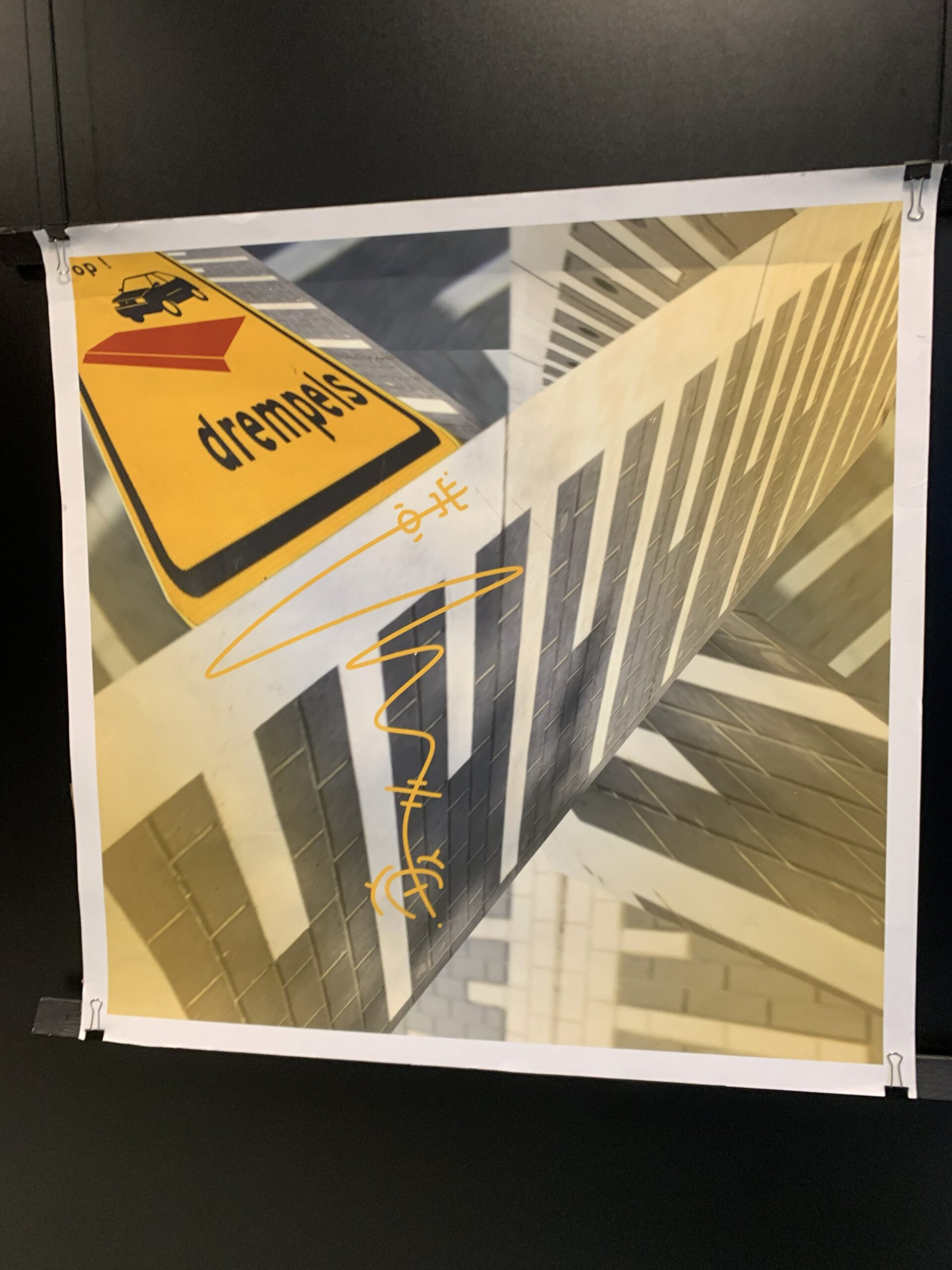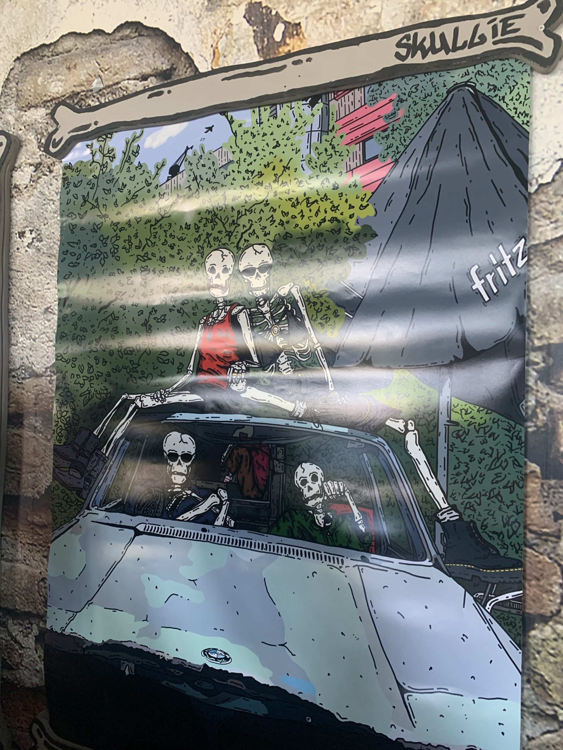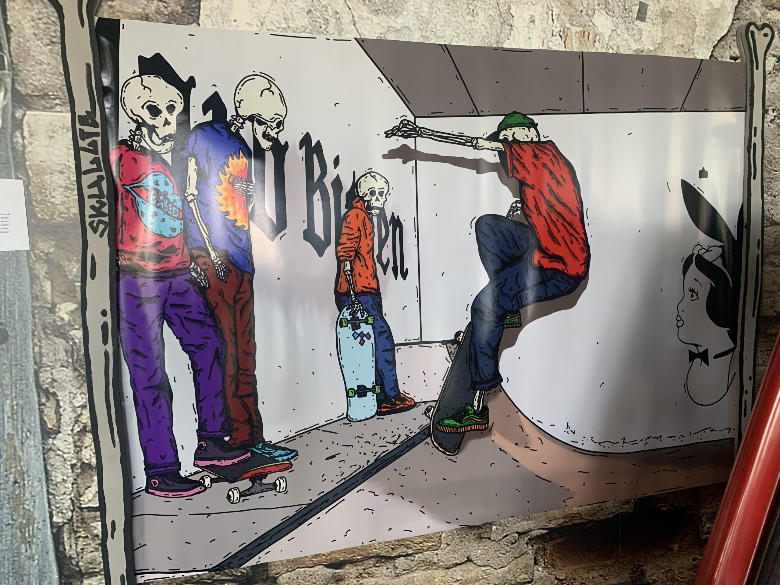 De auteur kwam in de Cultuurdome het werk van Niels Hanewald tegen. Het werk betreft een paar Magere Heinen. Of, beter gezegd Heinen van de Scene. Een voorstelling op de plek ‘Hard Bitten and The Others’, waar de maker graag kwam. En de huidige setting. De levende skeletten kijken elkaar en de toeschouwer aan alsof ze het naar hun zin hebben. In een andere prent van hun tweeluik, waarin ze op een halfpipe zijn, kijken zij toe hoe een van de skaters moeiteloos een vermoede backflip weet te maken. Dat Hanewalds pseudoniem Skullie is, valt ook te verwachten. Net zoals de stadse fratsen. Soit, het gaat over Almere specifiek, en hoe de maker zich hier o.m. creatief kon uiten, maar eigenlijk is het meer dan enkel Almere. De legerkistjes, de wijd uitvallende kleding en bepaalde schoenen (Vans, maar ook die met ster) stralen bredere stedelijke cultuur uit.