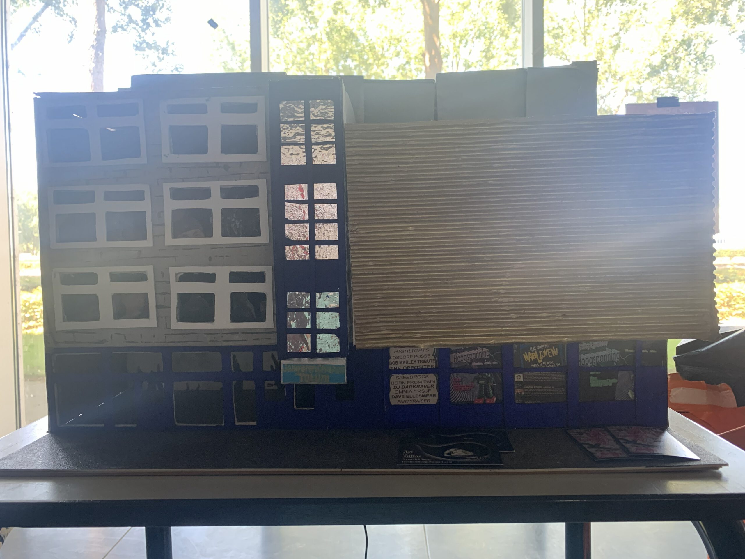 v.l.n.r.: de voorkant, de achterkant en een inkijkje in de diorama van Leroy Sickboy (Jongerencentrum Totem)